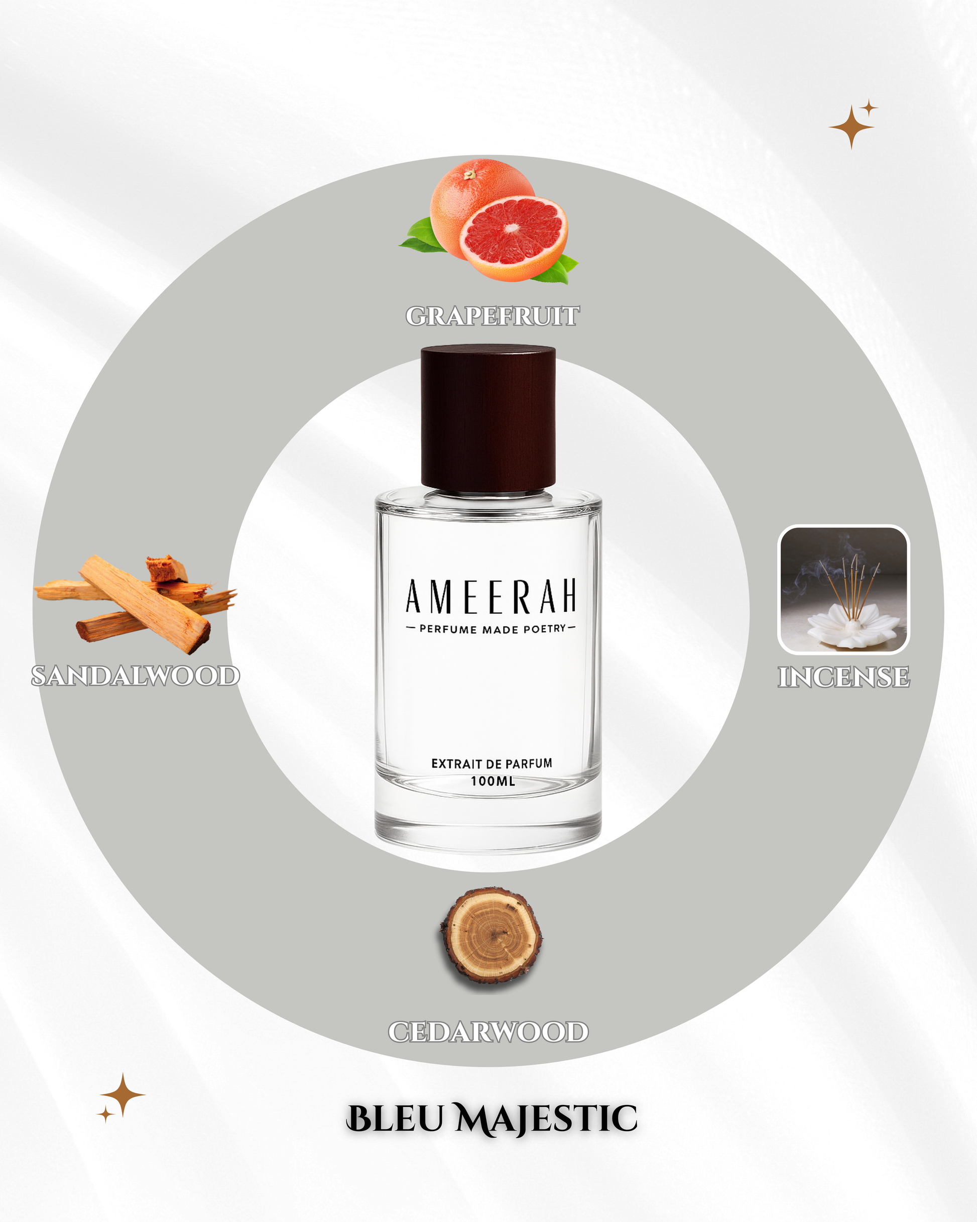 Discover Bleu Majestic from Ameerah Perfumes, a fragrance that defines modern sophistication. It opens with a vibrant burst of grapefruit, which elegantly unfolds into a heart of mystical incense and aromatic cedarwood. Anchored by the creamy warmth of sandalwood, this cologne creates a trail of timeless, confident elegance. The ultimate signature scent for the discerning man.