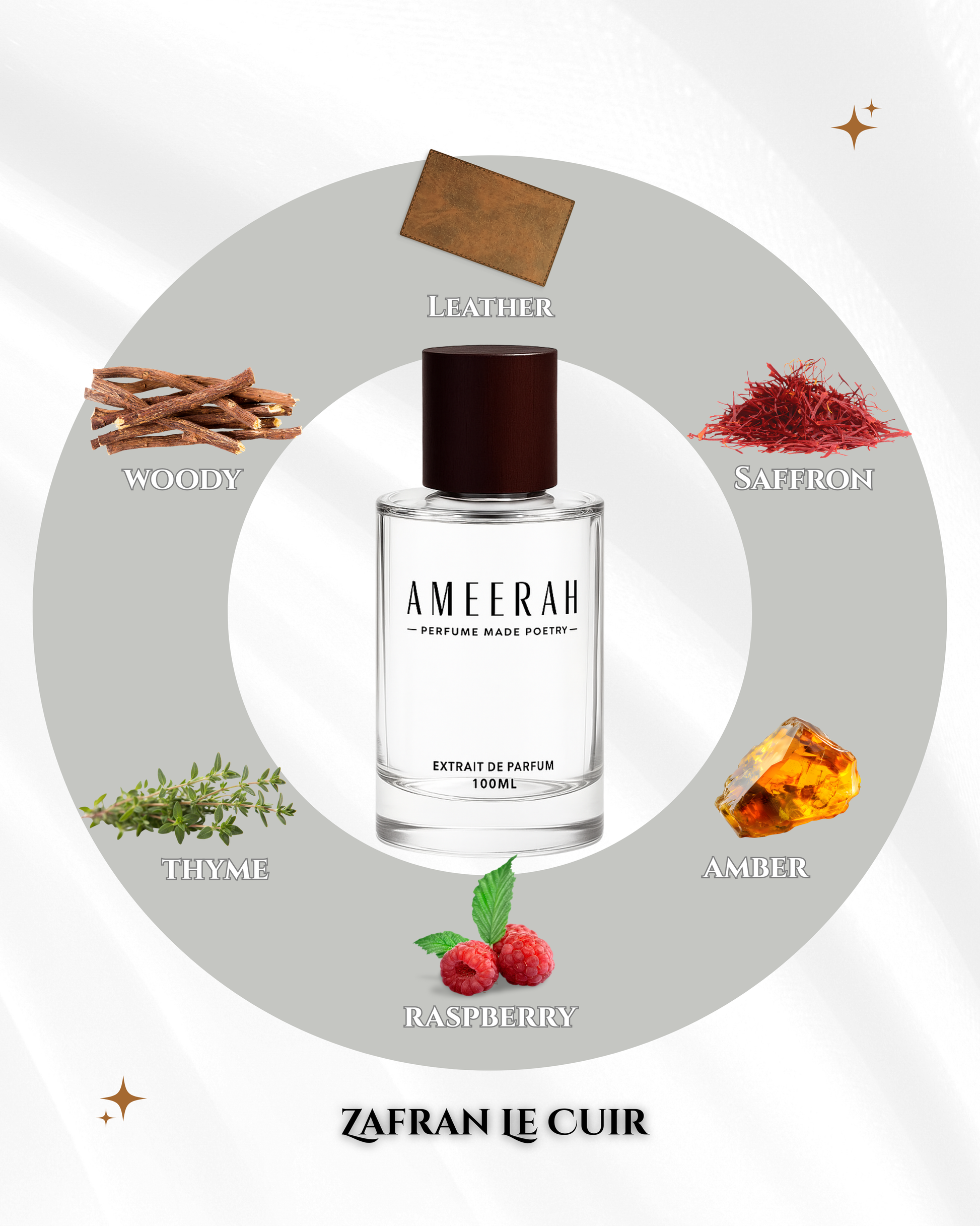 Discover bold sophistication with Zafran Le Cuir from Ameerah Perfumes. This distinctive fragrance opens with the rich texture of leather and the luxurious spice of saffron, brightened by a hint of fresh thyme. The juicy touch of raspberry adds a modern twist, while amber and woody notes create a warm, lasting foundation. A uniquely complex and inviting scent for all to wear.